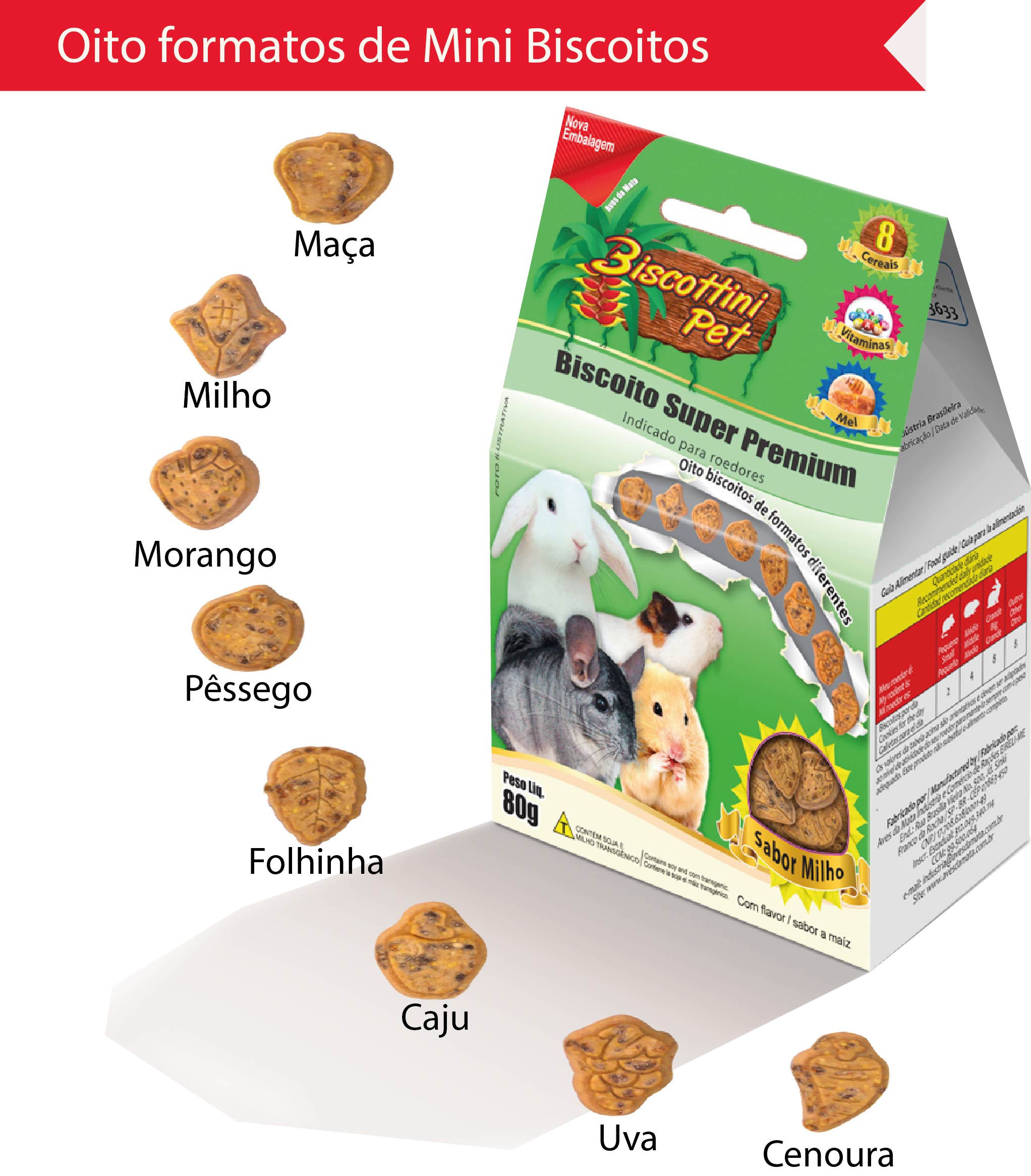 - O Biscottini Pet tem vários formatos (maçã, morango, caju, milho, uva, cenoura, pêssego e folhinha) no tamanho ideal para que você possa adestrar, interagir, distrair e se divertir com a seu pet;